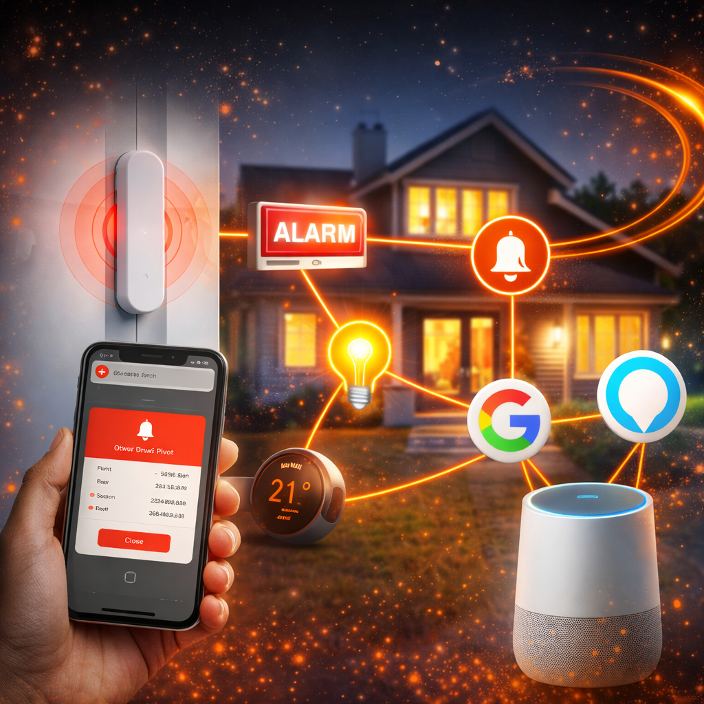 TajnyCzujnik™ pozwala zautomatyzować bezpieczeństwo domu i połączyć je z systemem smart home. Możesz ustawić automatyczne scenariusze, które uruchomią alarm, światło lub inne urządzenia po wykryciu otwarcia drzwi.